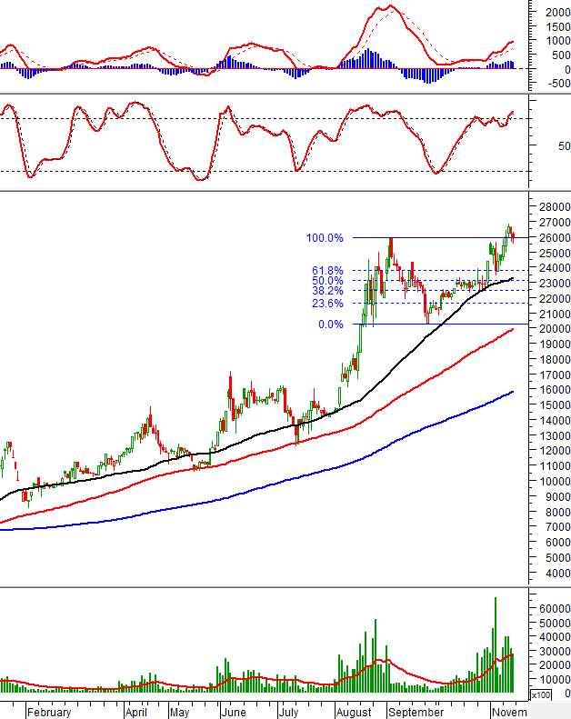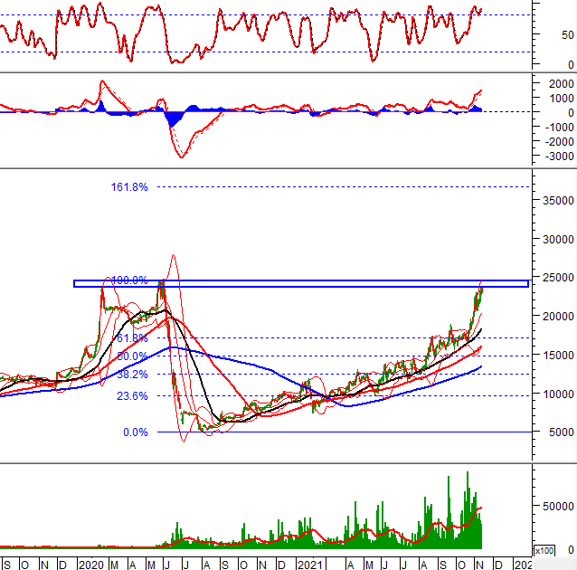Hình ảnh bóng nến dưới dài xuất hiện tại đây trong phiên giao dịch ngày 12/11/2021 thể hiện lực mua đang xuất hiện tại đây. Nếu vùng này vẫn trụ vững thì TVB sẽ có cơ hội hướng đến ngưỡng Fibonacci Retracement 161.8% (tương đương vùng 29,000-30,000).