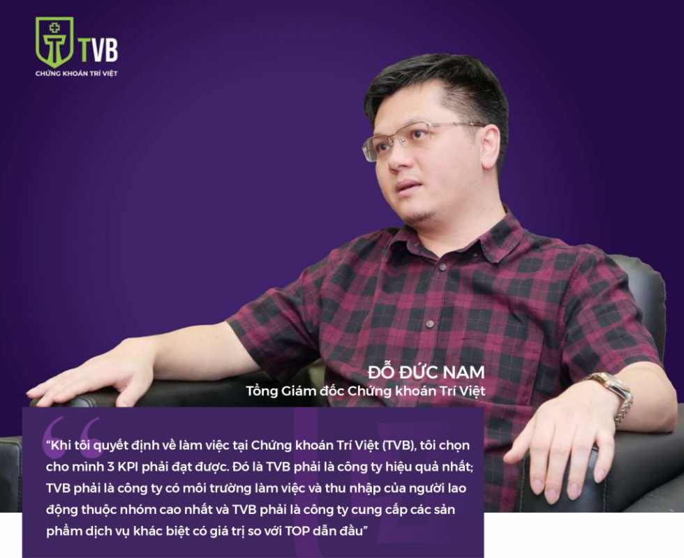 “Khi tôi quyết định về làm việc tại Chứng khoán Trí Việt (TVB), tôi chọn cho mình 3 KPI phải đạt được. Đó là TVB phải là công ty hiệu quả nhất; TVB phải là công ty có môi trường làm việc và thu nhập của người lao động thuộc nhóm cao nhất và TVB phải là công ty cung cấp các sản phẩm dịch vụ khác biệt có giá trị so với TOP dẫn đầu”. Doanh nhân Đỗ Đức Nam, Tổng giám đốc TVB mở đầu cuộc trò chuyện và cho biết, sau 2 năm, các cổ đông TVB đang có một công ty chứng khoán lớn lên mạnh mẽ. “Tôi đặt niềm tin tuyệt đối vào “Sứ mệnh Thịnh Vượng” mà chúng tôi đã chọn cho TVB và chúng tôi đang hiện thực hóa sứ mệnh ấy”.