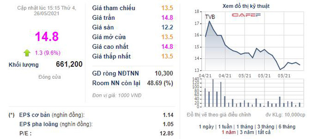 Trên thị trường chứng khoán, kết thúc phiên giao dịch ngày 26/5 cổ phiếu TVB tăng trần 9,6% lên mức 14.800 đồng/cổ phiếu.