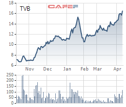 Cổ phiếu TVB đang niêm yết tại HSX nhưng đã chuyển giao dịch tạm thời sang HNX từ ngày 16/4 theo sự kêu gọi của Uỷ ban Chứng khoán Nhà nước, diễn biến cổ phiếu trong 6 tháng qua đang trong xu hướng tăng giá, đóng cửa phiên hôm nay 19/4 với mức giá 17.200 đồng.