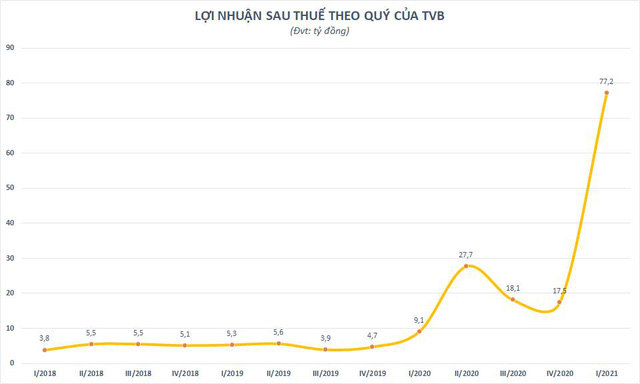 Đối với mảng môi giới, nhờ lựa chọn hướng đi riêng biệt trong phát triển khách hàng, TVB đã tận dụng tối đa sự sôi động chưa từng có của thị trường xuất phát từ làn sóng nhà đầu tư mới tham gia. Hoạt động môi giới khởi sắc mang về cho CTCK này gần 25 tỷ đồng doanh thu, gấp 3,6 lần cùng kỳ năm trước. Doanh thu từ hoạt động cho vay ký quỹ (margin) cũng tăng gấp đôi so với Quý I/2020, đến cuối năm 2020 dư nợ cho vay margin của TVB vào khoảng hơn 500 tỷ đồng, gần bằng vốn chủ sở hữu. Biểu đồ lợi nhuận sau thuế theo quý của TVB cho thấy xu hướng bứt phá lợi nhuận khá rõ nét.