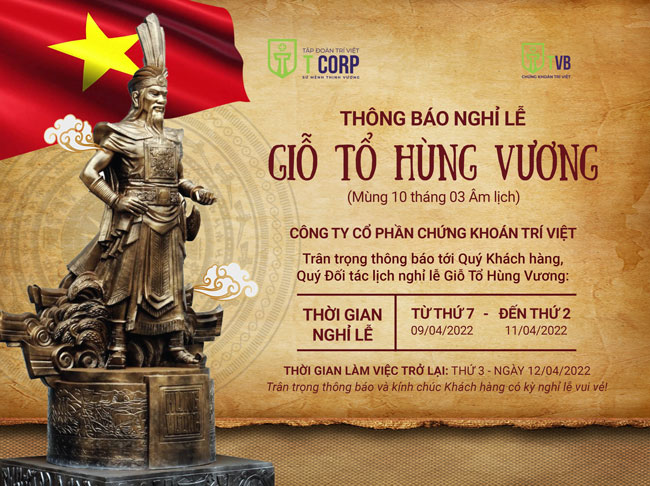 Công ty Cổ phần Chứng khoán Trí Việt (MCK: TVB) xin trân trọng thông báo tới Quý Khách hàng, Quý Đối tác lịch nghỉ lễ Giỗ Tổ Hùng Vương (Mùng 10 tháng 03 Âm lịch):