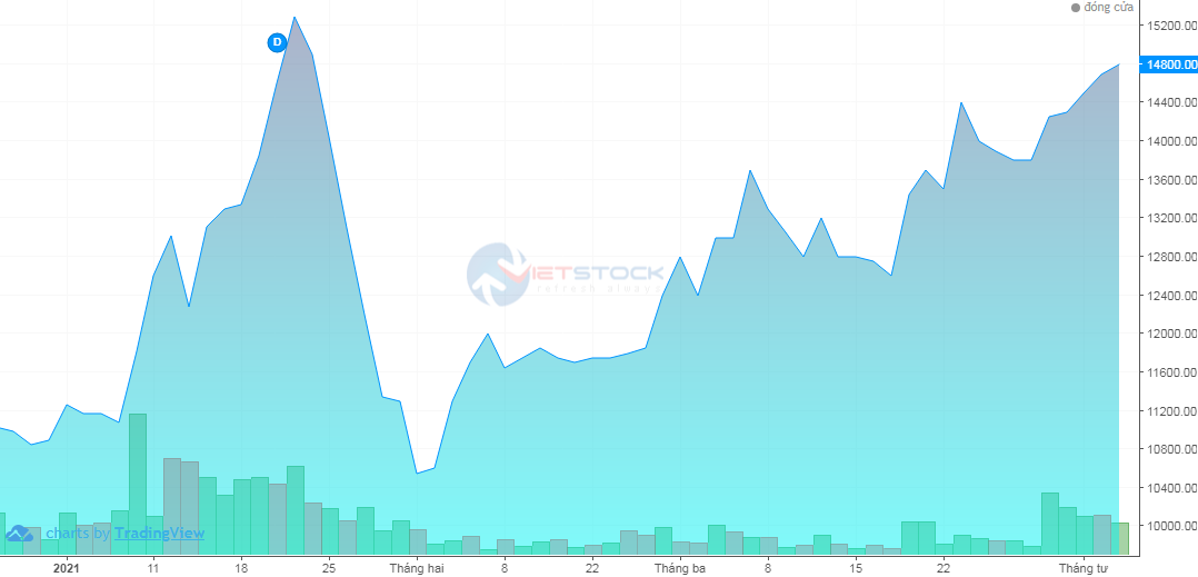 Kể từ cú sụp của thị trường chứng khoán hồi cuối tháng 1/2021 đến nay, giá cổ phiếu TVB liên tục nằm trên đà tăng và dần áp sát mức đỉnh được lập trong tháng 1. Chốt phiên 05/04, giá cổ phiếu TVB ở mức 14,800 đồng/cp, tăng xấp xỉ 31% so với đầu tháng 2/2021.