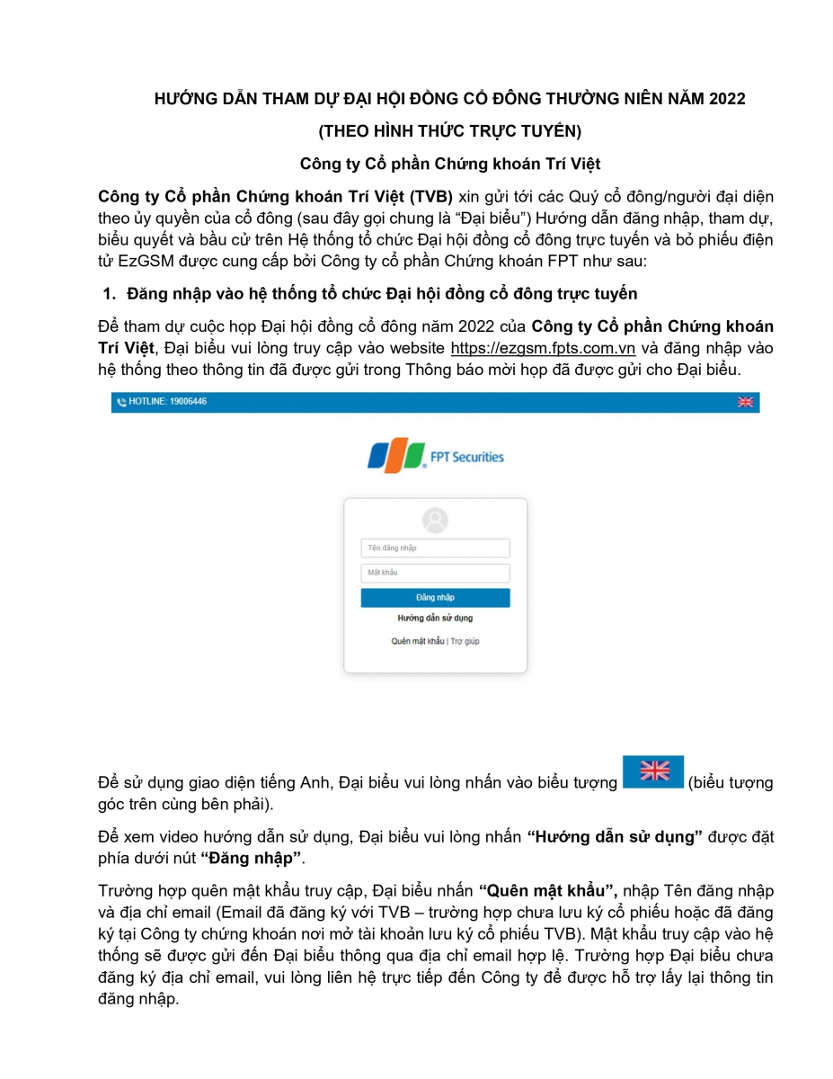 HƯỚNG DẪN THAM DỰ ĐẠI HỘI CỔ ĐÔNG THƯỜNG NIÊN NĂM 2022 (THEO HÌNH THỨC TRỰC TUYẾN)