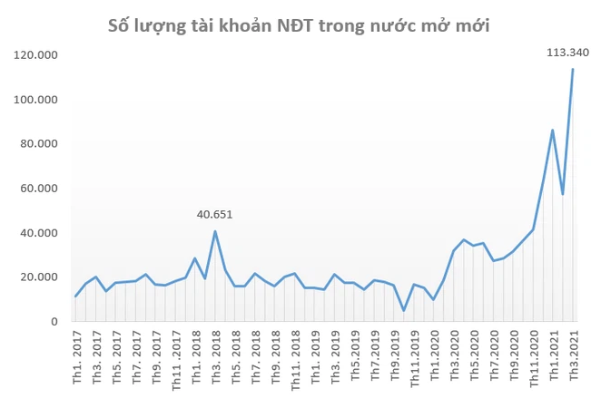 Số liệu từ Trung tâm lưu ký Chứng khoán Việt Nam (VSD) cho biết trong tháng 3, nhà đầu tư trong nước đã mở mới 113.340 tài khoản chứng khoán, đây là con số kỷ lục chưa từng có từ trước tới nay, tương đương 29% tổng tài khoản được mở mới trong cả năm 2020.