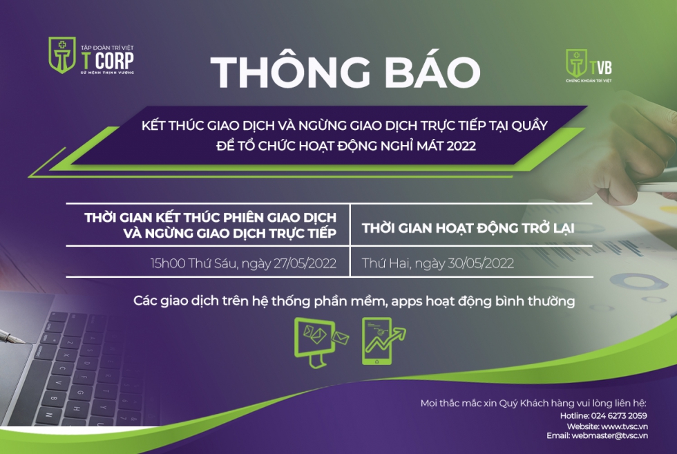 Nhân kỷ niệm 10 năm ngày thành lập CTCP Tập đoàn Quản lý tài sản Trí Việt (TVC) và căn cứ kế hoạch tổ chức sự kiện du lịch, nghỉ mát dành cho Cán bộ nhân viên, Tập đoàn Trí Việt trân trọng thông báo đến Quý Đối tác, Quý Khách hàng về việc kết thúc phiên giao dịch và ngừng giao dịch trực tiếp sớm tại quầy như sau: