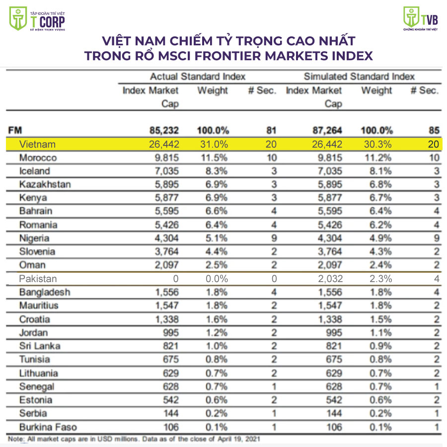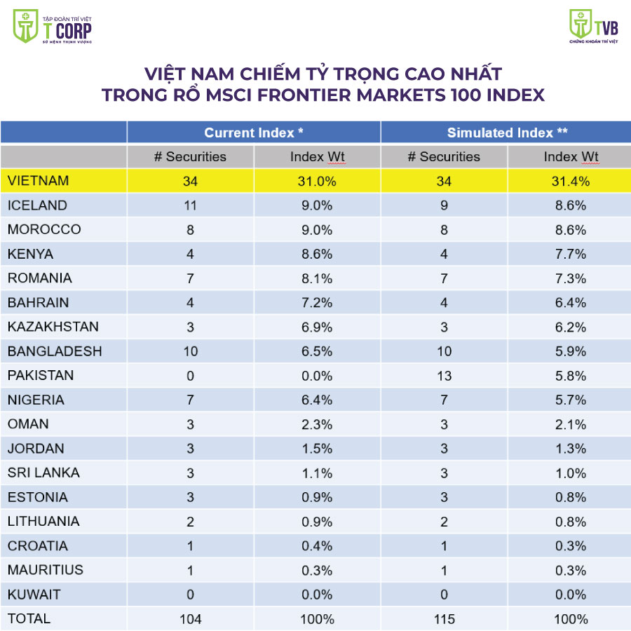 Còn với rổ MSCI Frontier Markets 100 Index, thị trường Việt Nam giữ vững vị trí số 1 với tỷ trọng 31,4% (tăng nhẹ 0,4% so với hiện tại) và số lượng cổ phiếu giữ nguyên ở con số 34.